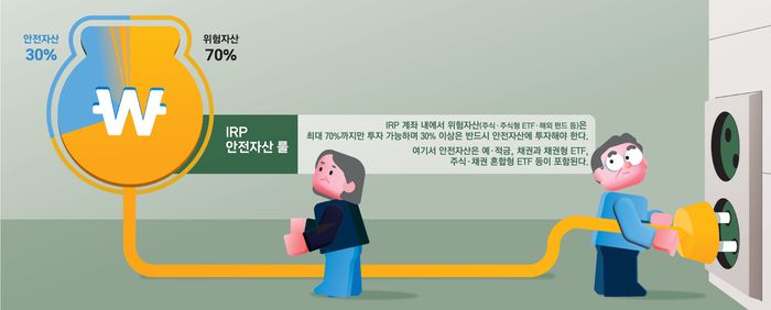 IRP 계좌 내에서 위험자산(주식·주식형 ETF·해외 펀드 등)은 최대 70%까지만 투자 가능하다. 30% 이상은 반드시 안전자산에 투자해야 한다. 보통 안전자산이 예·적금과 채권처럼 만기 보유 시 원리금 보장 상품이라고 생각하지만 버젓이 주식·채권 혼합형 ETF도 포함돼 있다.