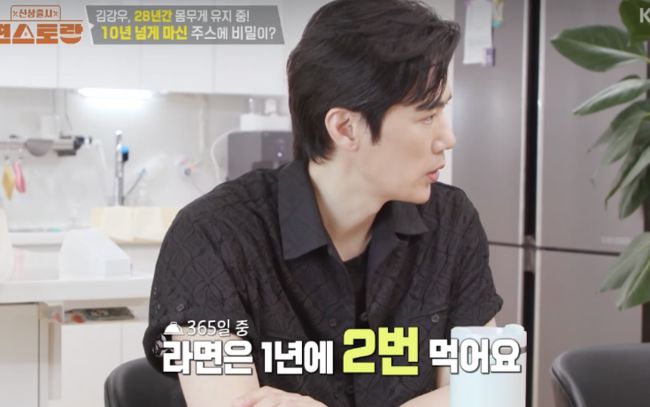 [OSEN=김수형 기자]’편스토랑’에서 김강우가 28년간 유지 중인 몸무게를 공개, 특히 라면은 1년에 두 번 먹는다고 해 모두를 놀라게 했다.