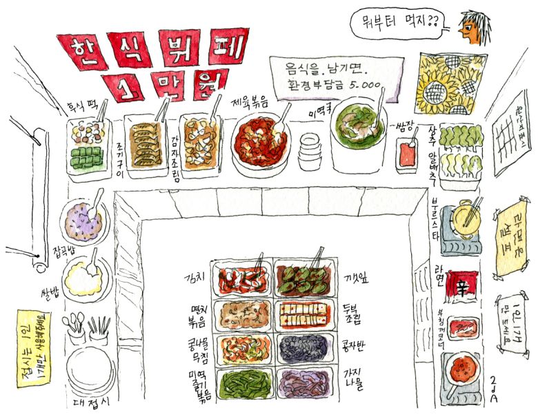 옛날엔 누가 나에게 밥을 주는 게 당연한 줄 알았다. 때가 되면 밥이 있었다. “밥 먹어라!” 소리가 들리면 밥을 먹으면 됐다. 어른이 된 지금은 단 한 끼도 내 의지 없이는 입에 들어오지 않는다. 밥을 사 먹으러 가거나, 배달시켜 먹거나, 내가 해서 먹거나. 뭐든 결정을 내려야 한다. 한식뷔페는 그 결정을 쉽게 만들어준다. 감사하다. 내가 먼지투성이든지 땀을 진탕 흘렸든지 어떤 모습으로 가도 한식뷔페는 묵묵히 나를 맞이해준다. 여기는 내가 대접받는 곳도 서비스를 받는 곳도 아니다. 그들은 밥을 주고, 나는 감사히 먹는다.