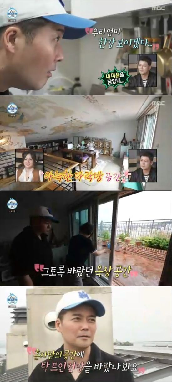 전현무는 공인중개사를 따라 올라간 다락방 공간 옆으로 옥상이 펼쳐진 것을 보자마자 "여기가 1등이네"라고 만족감을 드러냈다.