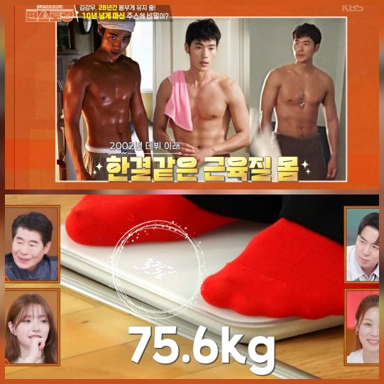 15일 방송된 KBS2 ‘신상출시 편스토랑’에서는 47세 김강우의 변함없는 체형 관리 비법이 소개됐다. 그는 “고3 때 몸무게와 지금이 똑같다”며 실제 측정 결과 75.6kg를 기록했다.