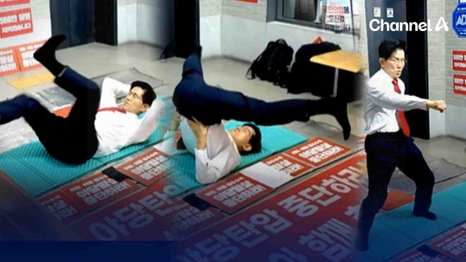 특히 기마 자세로 태권도 정권 지르기를 할 때는 지지자들이 “때려잡자”는 구호로 박자를 맞춰 응원하기도 했다. 운동을 마친 김 후보는 “아유 개운하다”며 다시 농성을 이어갔다.