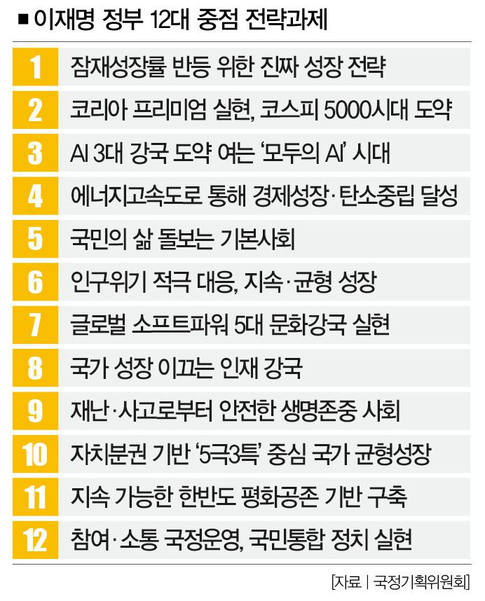 국정기획위는 5년 임기 동안 중점 추진할 12대 전략과제도 선정했다. 에너지 고속도로 구축과 코스피 5000 달성, 국민 삶을 돌보는 기본사회, 5대 문화강국 실현, 인구위기 대응 등 대선 공약과 최근 사회적 논란의 대상인 생명·안전사회 대책을 포함했다.