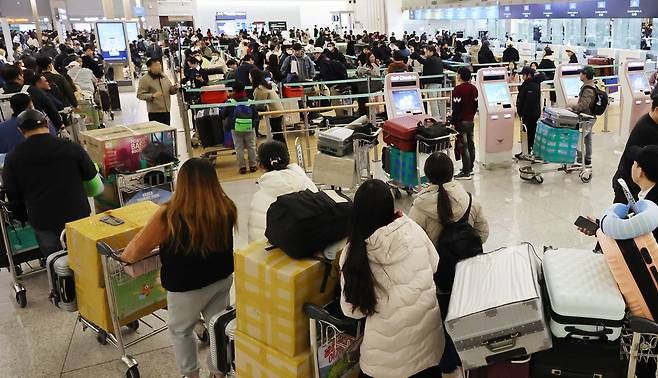 설 명절 연휴를 앞둔 지난 1월 23일 인천국제공항 제1여객터미널 출국장에서 승객들이 탑승 수속을 위해 줄을 서고 있다. [사진 = 연합뉴스] |