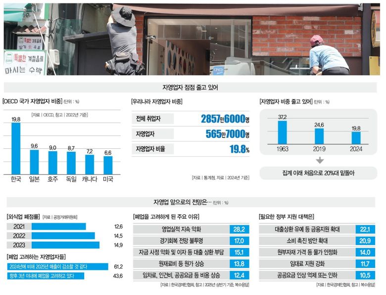2024년 19.8%. 국내 취업자 중 자영업자 비중이다. 집계 이래 처음으로 20% 선이 무너졌지만 여전히 높은 수치다. 일본과 미국의 자영업자 비중은 9.6%, 6.6%에 불과하다. 지금보다 더 줄어드는 게 '통계적'으론 옳은 방향이지만, 냉정하게 살펴봐야 할 점이 있다. 자영업자 비중이 줄어든 이유가 대부분 폐업이어서다. 많은 이들이 골목상권을 살리자고 말하지만, 자영업 문제를 풀지 않으면 미래는 없다.