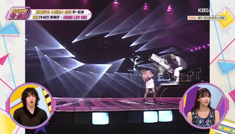 이날 10위에 랭크된 건 색종이의 ‘사랑이란 건’ 무대였다. 이는 1993년에 송출된 무대로, 와이어를 활용해 공중에 매달린 가수와 불꽃 쇼 등 특이한 특수 효과들을 활용한 연출이 함께 소개됐다. 이에 이미주는 “콘서트도 아니고 음악 방송에서 와이어를 쓴다”고 감탄했다.