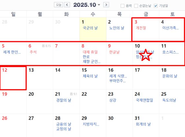 만일 10월 10일이 임시공휴일로 지정되면, 개천절과 추석 연휴가 7일에서 총 10일로 늘어난다.