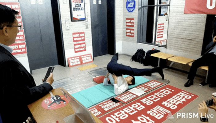 기마 자세로 태권도 정권 지르기를 할 때는 지지자들이 “때려잡자”는 구호로 박자를 맞춰 응원하기도 했다. 운동을 마친 김 후보는 “아유 개운하다”고 말하고 다시 농성을 이어갔다.