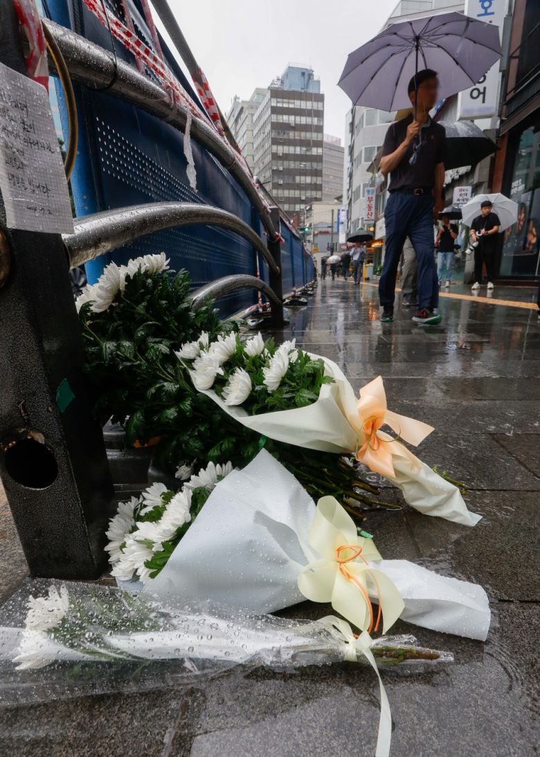 2일 지난 밤 대형교통사고가 발생한 서울 중구 시청역 인근 교차로 사고 현장에 고인을 추모하는 국화꽃이 놓여 있다. 1일 밤 역주행하던 승용차가 인도로 돌진해 보행자들을 덮쳐 9명이 숨지고 4명이 다치는 사고가 발생한 바 있다. 조현호 기자 hyunho@ |