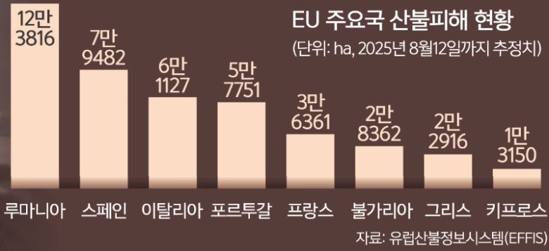 유럽연합(EU)의 기후변화감시기구 코페르니쿠스가 운영하는 유럽산불정보시스템(EFFIS)에 따르면 12일(현지시간) 기준 EU 소속 27개 국가에서 1599건의 산불이 발생해 서울 면적의 6.8배에 달하는 40만9220ha의 숲이 잿더미로 변했다. 2024년 한 해 동안 기록한 산불 피해 잠정치인 41만9298ha에 육박하는 수치를 7개월여 만에 기록한 것이다. 지난해 동일 기간에 1089건의 산불로 19만8643ha가 소실된 것과 비교하면 산불 건수는 약 46.8%, 소실면적은 116.9%나 늘었다.