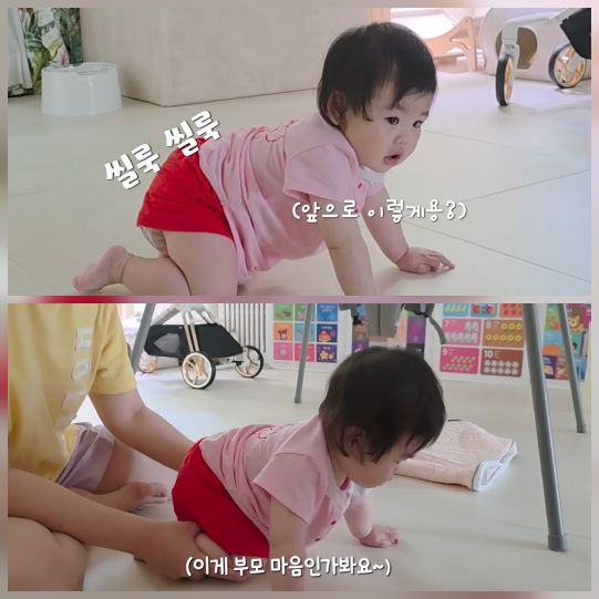 잠시 후 재이 양은 부모의 도움을 받아 네발기기에 성공했다. 이어지는 자막에는 “작은 거 하나에 걱정되기도 하고 기쁘기도 하고, 이게 부모 마음인가 보다”라는 문구가 담겨 공감을 자아냈다.