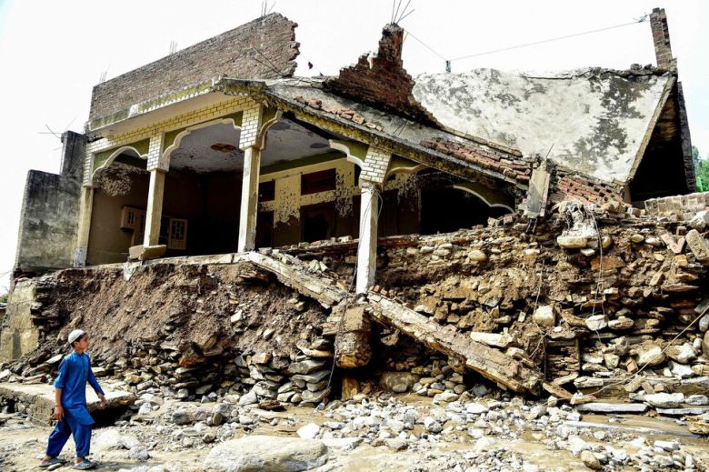현지시각 16일 기습 폭우로 인한 홍수 피해를 입은 파키스탄 북서부 카이버파크툰크와주 부네르 지구에 집이 무너져 있다. AFP/연합뉴스 |