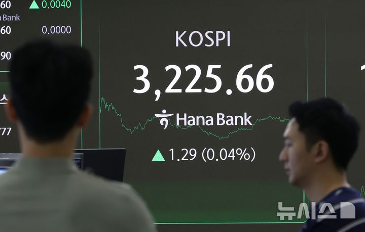 [서울=뉴시스] 황준선 기자 = 코스피가 전 거래일(3224.37)보다 1.29포인트(0.04%) 오른 3225.66에 마감한 14일 서울 중구 하나은행 딜링룸 전광판에 지수가 표시돼 있다. 2025.08.14. hwang@newsis.com |