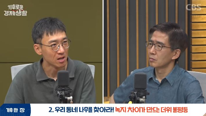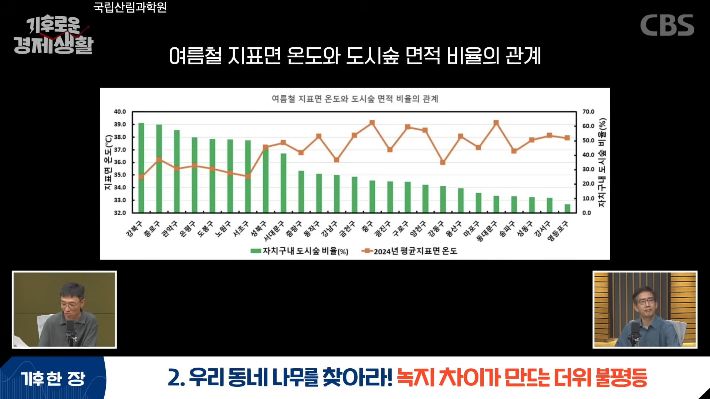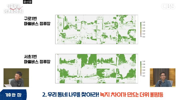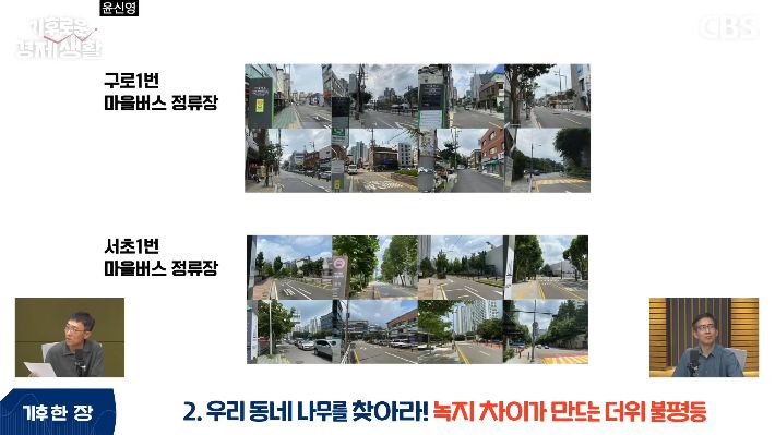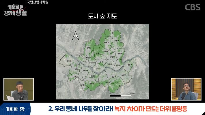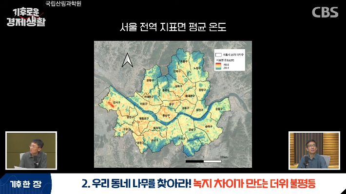 ◆ 홍종호> 서울시 또는 다른 대도시의 녹지 지도는 금방 만들 수 있죠. 이걸 보고 공공영역에서의 재원을 더 취약한 지역의 녹지 조성에 우선적으로 투입해야겠죠. 이런 의식을 가진 노력이 필요하겠다는 결론이 도출되는 것 같아요. 폭염 문제를 기후나 날씨만의 문제가 아니라 사회 불평등의 문제로도 봐야 한다는 굉장히 중요한 점을 지적해 주셨다는 생각이 듭니다. 자 여기까지 듣겠습니다. 지금까지 윤신영 기자와 이야기 나눴습니다. 고맙습니다.