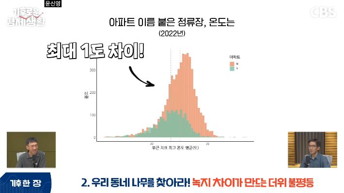 ◇ 윤신영> 네 그중에서도 특히 한국의 아파트 사랑이 각별하잖아요. 실제로 통계를 내보면 아파트 거주하는 거주민들의 자산이나 소득이 높은 경향이 있어요. 아파트가 밀집한 지역과 아닌 지역을 구분해서 하는 연구들이 항상 추가돼서 같이 보게 돼요. 결과를 보면 실제로 일치하는 경향이 보입니다. 빌라 같은 저층 주거지보다 아파트 단지가 있는 지역에서 지표 온도가 약 2도씩 낮게 측정되고 있어요. 연구마다 다르긴 하지만요.