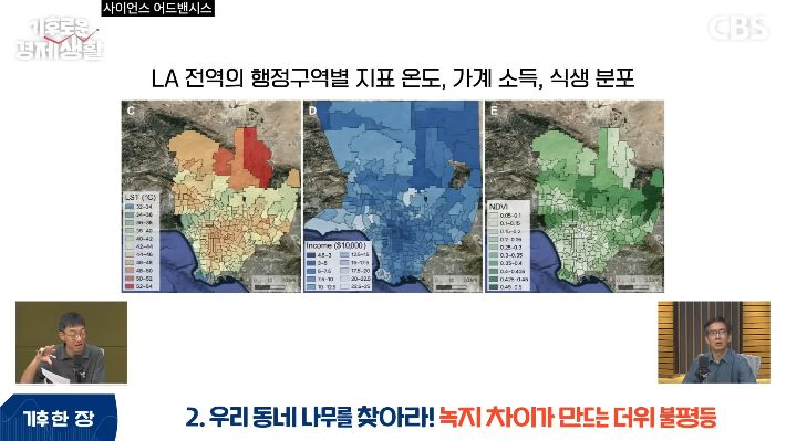 ◇ 윤신영> 미국 연구가 여러 편이 있는데요. 한국과 달리 주로 대도시가 평지에 있기 때문에 이런 연구들이 굉장히 잘 맞아요. 2023년에 미국의 캘리포니아 공대인 칼텍(Caltech)에서 했던 연구인데 최근에 가장 명쾌한 연구여서 가져왔습니다. LA 지역 전역의 녹지와 지표면 온도, 사회경제적 지표들을 같이 살펴본 연구였습니다. 저소득층 주거 비율이 높은 곳일수록 녹지 비율이 굉장히 낮고요. 지표 온도가 높다는 걸 정량적으로 밝혔어요. 소득이 1만 달러, 우리 돈으로 약 1300만 원 정도 떨어질 때마다 지표 온도가 0.6도씩 올라가는 것으로 나타났습니다.