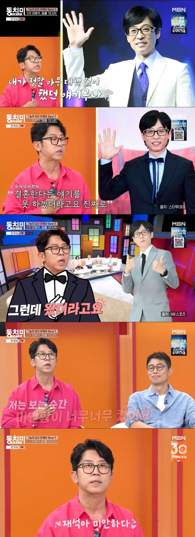그는 "(결혼식에) 와준 미안함과 때를 기다리라는 말이 상처였다는 생각이 든다. 미안하다"라며 카메라를 향해 유재석에게 공개 사과를 건네 눈길을 끌었다.