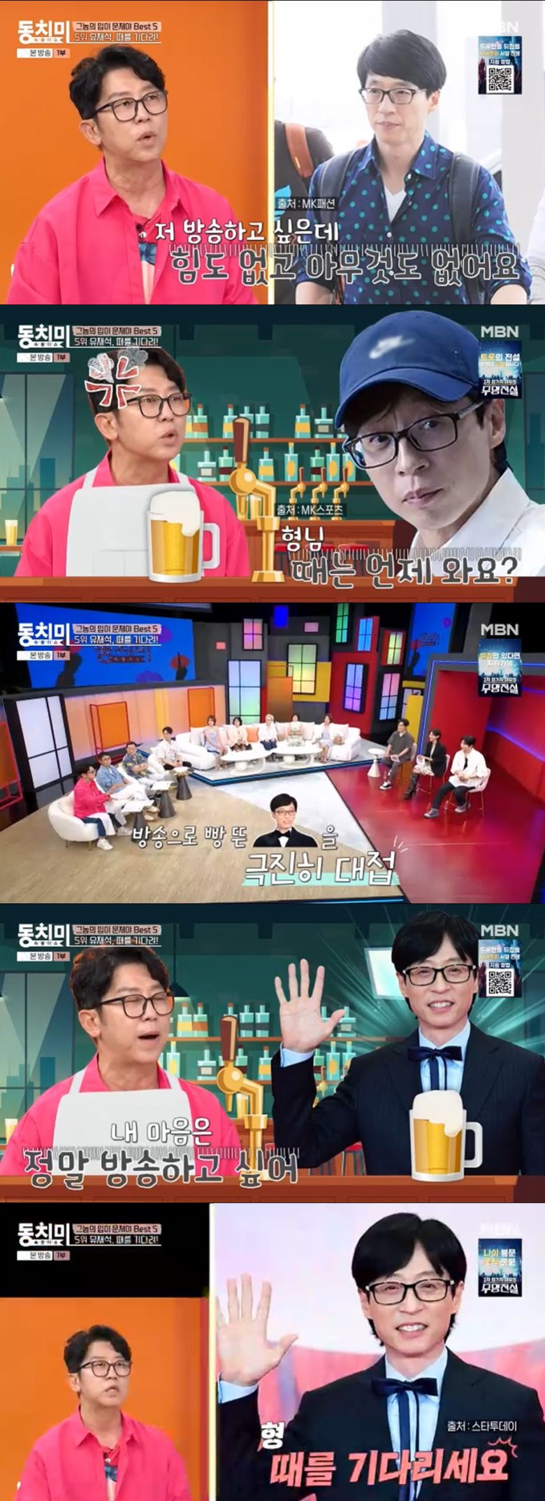 그는 "유재석에게 '사실 형도 너처럼 방송하고 싶다. 근데 아는 데도 없고 길이 없다. 그렇지만 마음은 방송하고 싶다'고 했다. 그러니 재석이가 맥주를 마시고 절 보며 '때를 기다리세요' 이러더라"며 되로 주고 말로 받은 상황을 전했다.