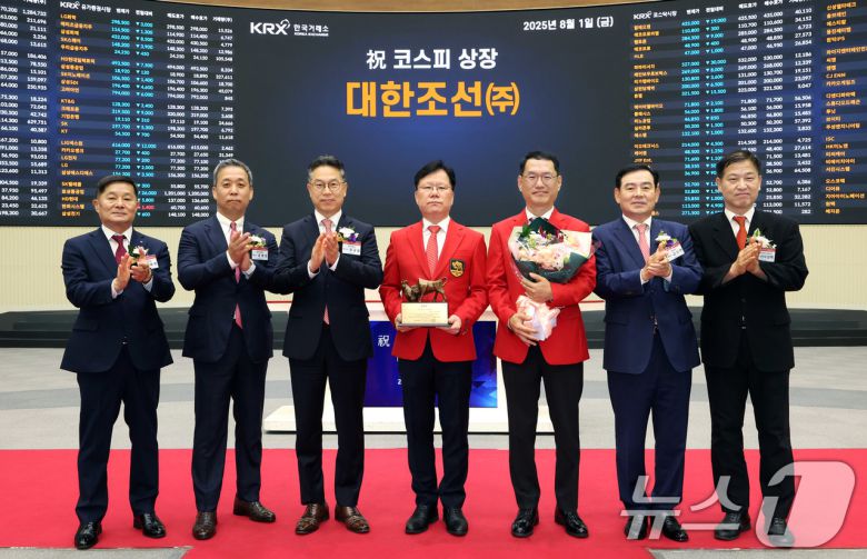 1일 서울 영등포구 한국거래소에서 열린 대한조선의 유가증권시장 신규상장기념식에서 양태영 한국IR협의회 회장(왼쪽부터), 윤병운 NH투자증권 대표이사, 정규일 한국거래소 유가증권시장본부장, 왕삼동 대한조선 대표이사, 이석문 대한조선 대표이사, 김성현 KB증권 대표이사, 선우정택 한국상장회사협의회 부회장이 상장기념패 전달 후 기념 촬영을 하고 있다. [한국거래소 제공] |