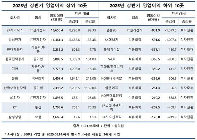 그 뒤로 △한국전력공사(3조3399억원·131.0%) △한국수력원자력(2조2035억원·1132.0%) △한화(1조6431억원·215.0%) △한화에어로스페이스(1조291억원·259.7%) △KT(7031억원·70.3%) △HD현대중공업(6883억원·317.3%) △한화오션(5870억원·1356.5%) △LG에너지솔루션(5141억원·145.8%) △두나무(5062억원·1180.5%) 순으로 영업이익이 늘어났다.