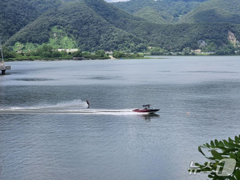 17일 낮 12시쯤 강원 춘천 의암호 일대에서 한 관광객이 수상스키를 타며 무더위를 날리고 있다.2025.8.17 한귀섭 기자