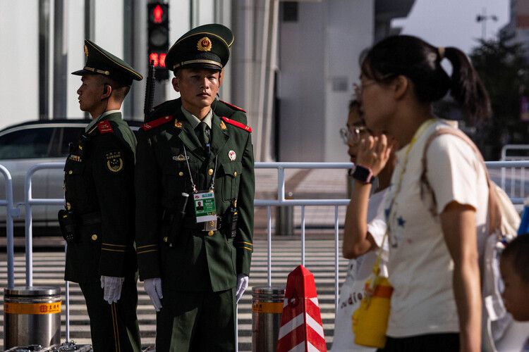 16일 오후 중국 베이징 왕푸징에서 ‘중국 인민의 항일전쟁 승리 및 세계 반파시스트 전쟁 승리 80주년’ 기념 군사 퍼레이드 리허설을 앞두고 무장 경찰들이 경비를 서고 있다. 로이터 연합뉴스 |