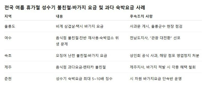 “매년 여름 휴가철 성수기때만 되면 근절되지 않는 바가지 요금, 불친절 사례에 국내 관광지는 가기 싫어요.”