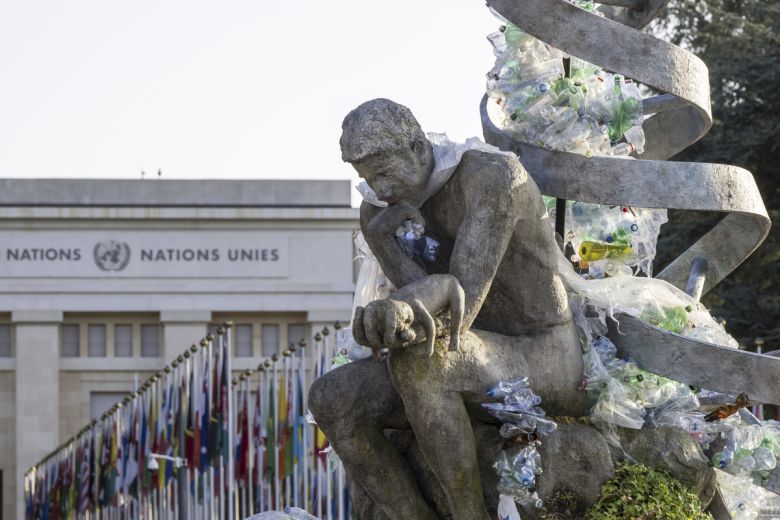 캐나다 예술가인 벤자민 폰 웡이 지난 15일(현지시간) 국제 플라스틱 협약을 위한 정부간 협상위원회가 열리고 있는 스위스 제네바 유엔사무소 앞에 ‘생각하는 사람의 짐’을 전시했다. 로댕의 상징적 작품인 ‘생각하는 사람’을 변주한 6m 높이의 작품이다. EPA연합뉴스