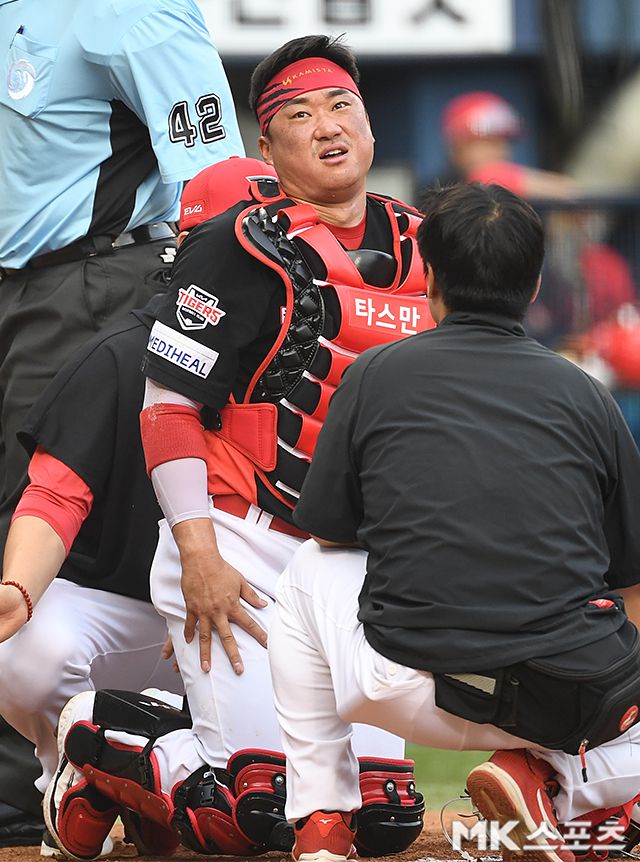 1회말 2사 두산 케이브 사구 때 급소에 공을 맞은 KIA 김태군이 고통스러워 하고 있다.