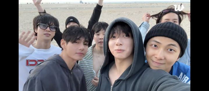 17일 하이브 팬 플랫폼 위버스를 통해 라이브 방송을 진행한 방탄소년단 일곱 멤버들은 편안한 차림으로 미국 로스앤젤레스(LA) 해변에 등장했다.