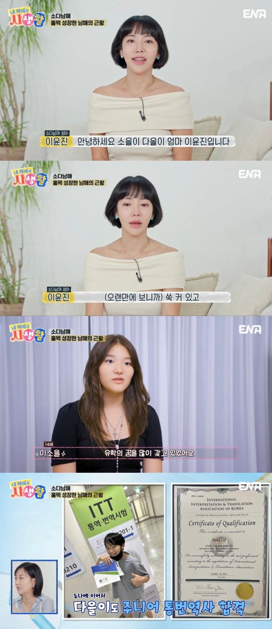 특히 소울은 통역사인 엄마의 재능을 물려받은 듯 주니어 통번역사를 합격했다는 소식으로 세 MC를 놀라게 했고, 이윤진은 아들 다을 역시 주니어 통번역사에 합격했다고 자랑했다.