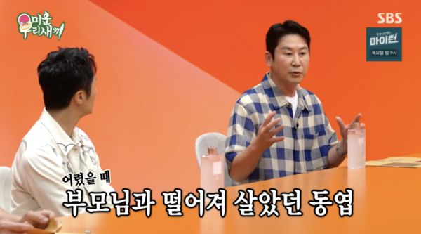 이들 모자의 사연을 듣던 MC 신동엽은 "중간에 보기 힘들었다”며 울컥했다. 그는 자신 역시 힘들었던 어린시절이 있었음을 고백했다. 신동엽은 "저도 4살 때 할아버지 사업이 잘 안 되면서 가정이 무너졌다. 아버지는 학교 선생님이었지만 빚을 갚아야 했고, 엄마는 일하러 나가야 했다. 그래서 부모님과 떨어져 살았었는데 일주일에 한 번씩 볼 때마다 '나 좀 데려가달라'라며 울고 불고 난리였다. 그 때 할아버지가 엄마 아빠 힘들게 한다며 회초리를 때리셨다"라고 털어놓았다.
