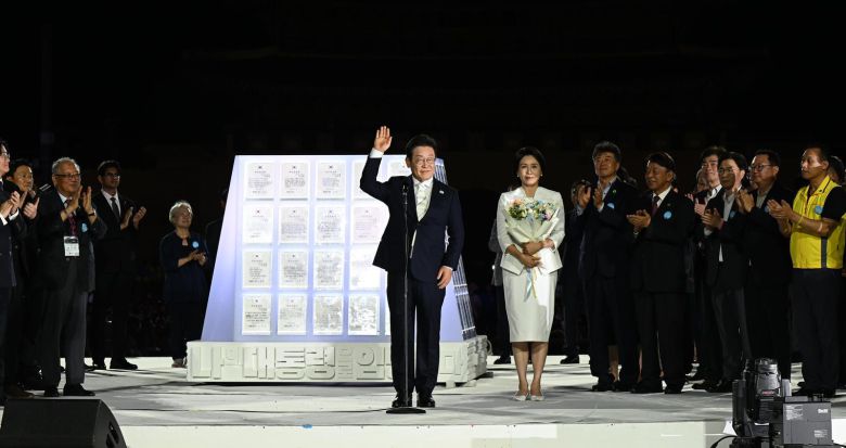 이재명 대통령이 15일 서울 세종대로 광화문광장에서 열린 제21대 대통령 국민임명식 ‘광복 80년, 국민주권으로 미래를 세우다’ 행사에서 임명장을 받은 뒤 인사를 하고 있다. 2025.08.15 뉴시스