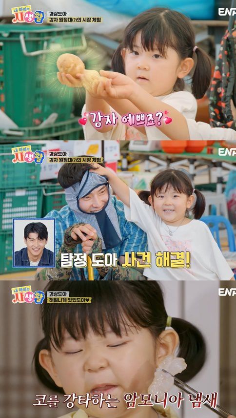 이날 도아와 승유는 직접 캔 감자를 가지고 시장에 갔다. 깜찍한 애교와 폭풍 먹방까지, 아이들의 귀여움이 시장 전체를 웃음으로 물들였다. 아빠 박정우는 할아버지 손님으로 분장해 도아를 찾아갔다. 그러나 도아는 숨길 수 없는 근육, 손의 굳은살을 보고 바로 아빠인 걸 알아차려 웃음을 자아냈다.