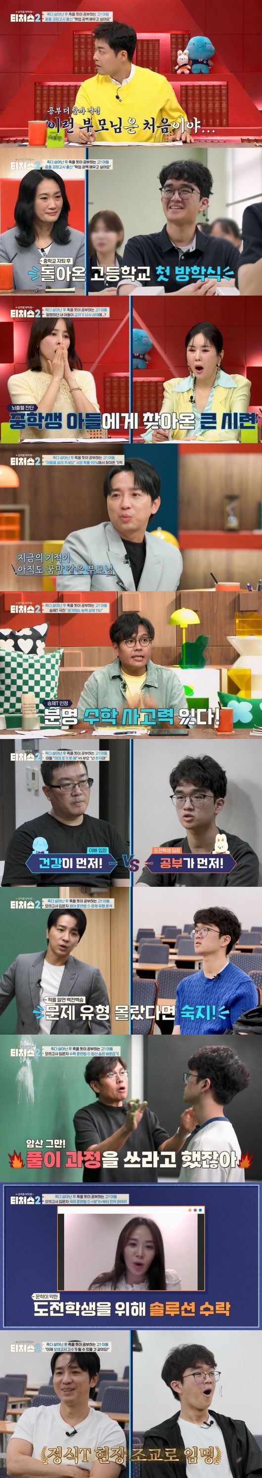 지난 17일 방송된 ‘티처스2’에는 죽을 고비를 넘긴 뒤 죽을 듯이 공부에 집착하는 고1 도전학생이 등장했다. 도전학생은 중2 때 뇌출혈로 뇌사 판정을 받고 자퇴했다. 사망 확률이 90%라는 진단을 받았지만 도전학생은 기적적으로 회복했고, 고1에 다시 학교로 돌아올 수 있었다. 일상으로 돌아와 행복한 학교생활 중인 도전학생은 중학교 공부 공백으로 뒤처질까 두려워하고 있었다. 죽을 고비를 넘긴 만큼 도전학생은 ‘신경외과 의사’를 꿈꿨고, 쓰러진 후 팔이 움직일 수 있게 되자마자 병상에서 수학 문제를 풀 정도로 공부에 대한 열정이 가득했다.
