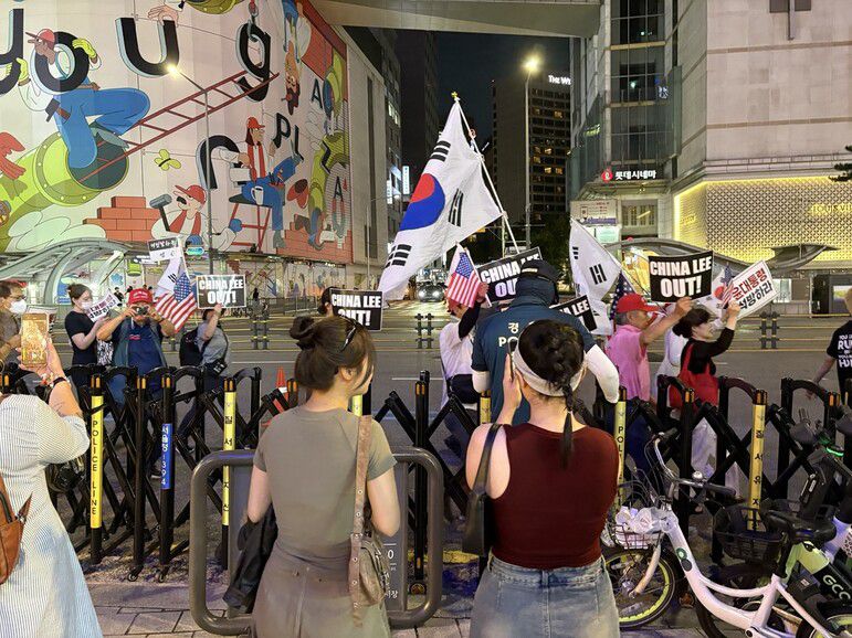 외국인 관광객이 북적이는 서울 중구 명동. 윤석열 지지 단체인 자유대학 등이 2025년 8월5일 저녁 연 ‘부정선거 대통령 선거 무효 및 윤 어게인 촉구’ 집회에 참여한 500여 명이 북소리에 맞춰 노래를 부르기 시작했다. 가사는 중국인 등에 대한 모욕으로 점철됐지만, 곡조는 케이(K)리그2(2부 리그) 수원 삼성 블루윙즈 서포터즈의 응원곡과 꼭 같았다. 이날 일부 집회 참여자는 가사만 바꾼 응원곡을 부르며 명동 거리를 찾은 아시아계 관광객을 향해 무차별적인 욕설을 쏟아냈다.