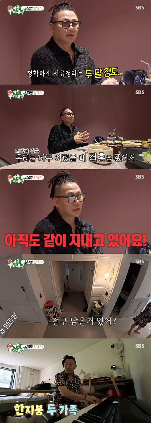 이어 공개된 윤민수의 집에서 그는 전 아내 김민지 씨와 함께 지내고 있는 듯한 모습이었다. 안방 전등이 깜빡거리자 전구를 찾던 그는 누군가에게 “전구 남은 거 있어?”라고 물었고, 집 한 쪽에는 ‘후 엄마 방’이라는 자막이 등장했다. 이후 방의 문이 열리는 소리가 들리면서 윤민수가 누군가와 동거 중인 사실이 알려진 것. 화면을 보던 스튜디오에서도 놀라는 모습이 이어졌다.