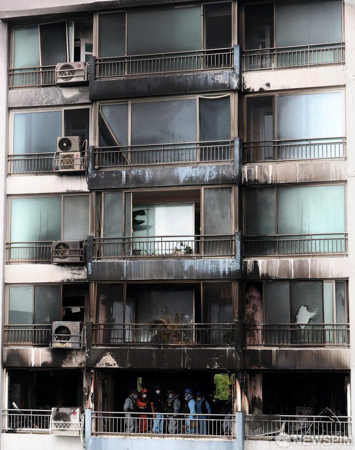 [서울=뉴스핌] 정일구 기자 = 18일 오전 서울 마포구 창전동 아파트 화재 현장에서 경찰과 소방 등 유관기관 관계자들이 합동감식을 하고 있다. 이 아파트에서는 전날 오전 8시 11분께 화재가 발생해 모자 관계인 20대 남성과 60대 여성 등 2명이 숨지고 16명이 다쳤다. 2025.08.18 mironj19@newspim.com