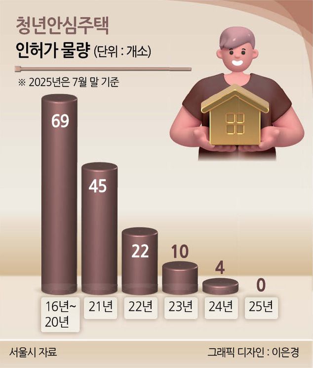 18일 서울시에 따르면 올해 7월 말 기준 인허가를 받은 신규 청년안심주택 사업장은 단 한 곳도 없다. 2021년 45곳이었던 청년안심주택 인허가 물량은 이후 2022년 22곳, 2023년10곳, 2024년 4곳으로 꾸준히 감소한 후 현재 역대 최저 수준을 보이고 있다.