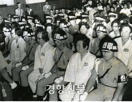 내란음모사건으로 계엄군법회의에 출두한 김대중 전 대통령(앞줄 오른쪽 두번째). 경향신문 자료사진 |