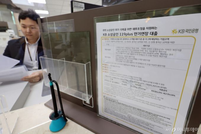 (서울=뉴스1) 황기선 기자 = 18일 서울 영등포구 KB국민은행 본점 여의도영업부에 '소상공인 119 플러스(PLUS)' 안내문이 걸려 있다. 전국은행연합회는 이날부터 전국 거래 은행 영업점에서 소상공인 맞춤형 채무조정 프로그램인 '소상공인 119plus'의 지원 신청을 받는다고 밝혔다. '소상공인 119plus'는 연체 우려가 있는 소상공인 차주가 연체 상태에 빠지지 않도록 최대 10년(신용 5년, 담보 10년)의 장기 분할 상환, 금리 감면 등을 지원한다. 2025.4.18/뉴스1 Copyright (C) 뉴스1. All rights reserved. 무단 전재 및 재배포, AI학습 이용 금지. /사진=(서울=뉴스1) 황기선 기자 |