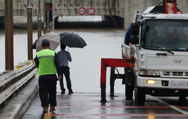 집중 호우가 내린 지난 13일 인천 계양구 용종사거리 지하차도에서 관계자들이 배수작업을 하고 있다. [사진 = 연합뉴스] |