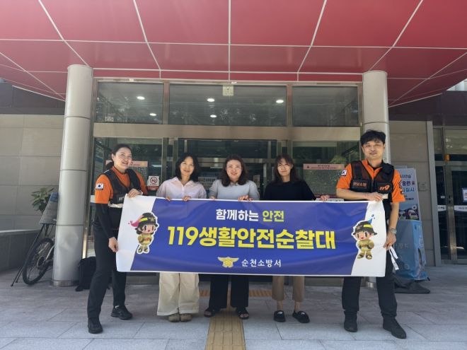 순천시 왕조1동 행정복지센터와 119생활안전순찰대 관계자들이 안전취약계층 지원을 위한 협력 후 기념사진을 찍고 있다. |