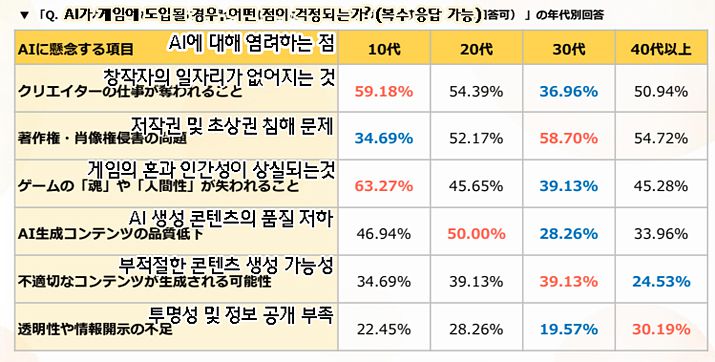 한편, 10대는 다른 연령대와 다소 다른 양상을 보였다. '최적화된 게임 경험'에 대한 기대(46.94%)가 가장 높았으며, 이는 즉각적인 게임 플레이 만족도에 집중하는 경향을 보여준다. 그러나 동시에 '게임의 '혼'과 '인간성' 상실(63.27%)'에 대한 우려도 가장 컸다. 이는 AI가 단순한 도구를 넘어 게임 본연의 가치를 훼손할 수 있다는 젊은 세대의 불안감을 반영한다. 또한, '크리에이터의 일자리가 없어지는 것(59.18%)'에 대한 염려도 가장 높아, 앞으로의 창작 생태계에 대한 보호 의식이 강한 것으로 보인다.