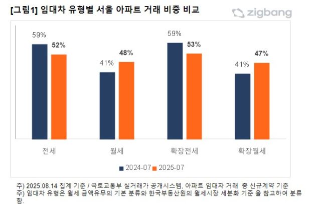 18일 부동산 프롭테크 기업 직방의 분석에 따르면 올해 7월 서울 아파트 전세 비중은 52%로 전년 동월(59%) 대비 7%포인트 낮아졌다. 반면, 월세 비중은 같은 기간 41%에서 48%로 7%포인트 상승하며, 두 지표가 거의 동일한 수준까지 접근한 것으로 나타났다. 직방은 국토교통부 실거래가 공개시스템에 등록된 서울 아파트 임대차 거래 중 신규 계약 건만을 기준으로 했다.