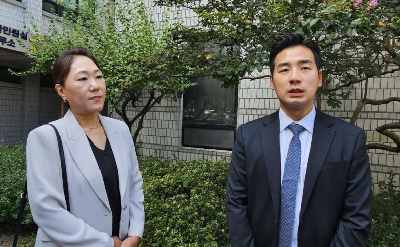 강혜경(왼쪽)씨와 그를 대리하는 문건일 변호사가 18일 창원지법에서 열린 공판 직후 취재진의 질문에 답하고 있다. 최상원 기자