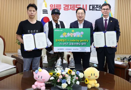대전시는 18일 오후 2시 30분 시청 10층 응접실에서 '꿈씨패밀리' 캐릭터를 활용한 스니커즈 공동브랜딩을 위해 대전관광공사, 코드바이젠트리, 미국 스니커즈 브랜드 쏘울컴퍼니(아시아 총판 운영사)와 4자 간 업무협약을 체결하고, 글로벌 시장 진출을 발표했다.