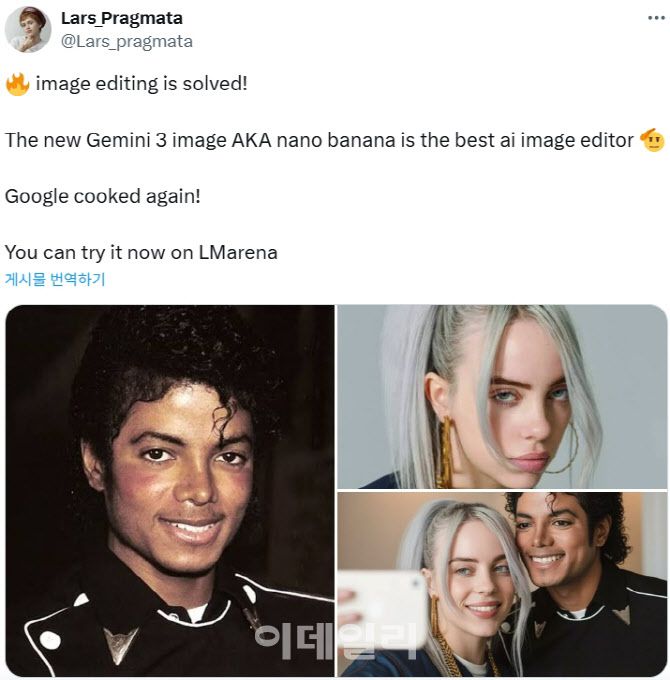 한편 나노바나나는 정식 버전이 아닌 만큼 AI 모델 성능 비교 사이트인 LM 아레나에서 사용할 수 있다. 나노바나나는 흐릿한 사진을 선명하게 해주고 서로 다른 두 이미지 합성이나 배경 교체, 얼굴 복원 등을 기존 이미지와 동일하게 그대로 기억해 재현하기 때문에 특히 자연스럽다는 평가를 받고 있다.
