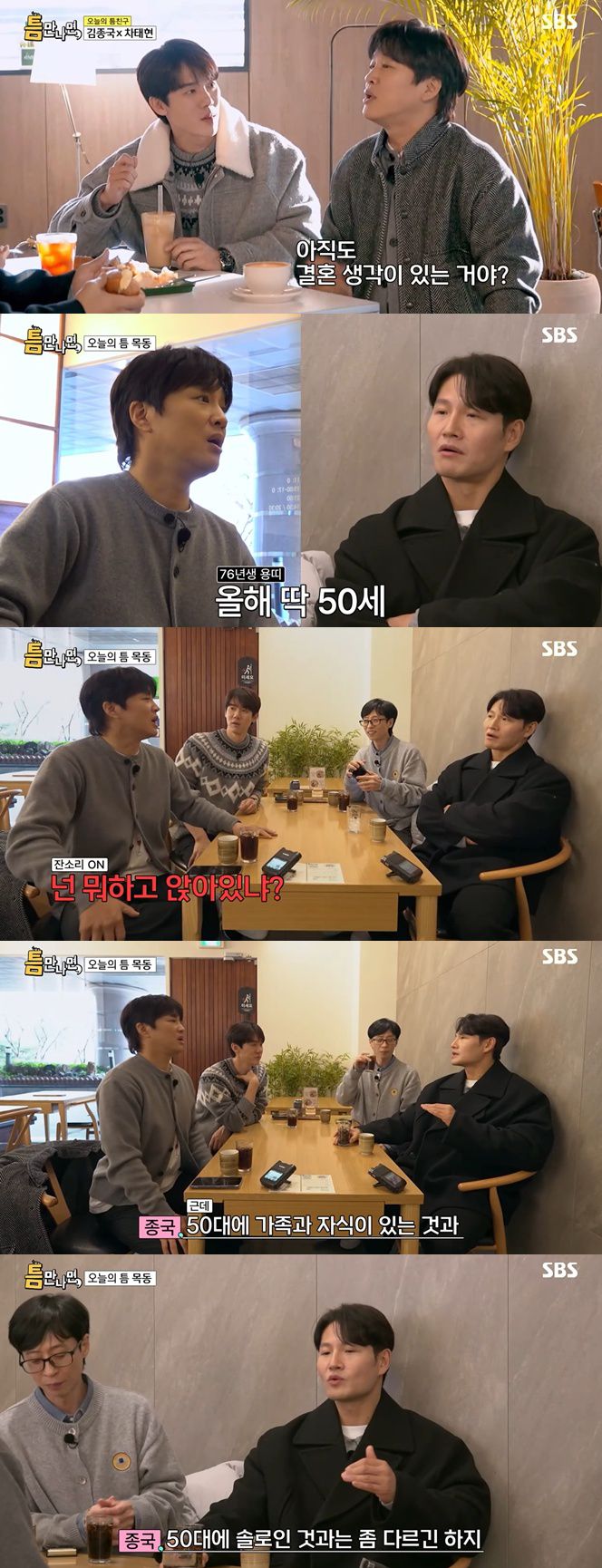 김종국이 결혼을 언급하자 차태현은 "아직도 결혼 생각이 있는 거야?"라고 의문을 표했고, 올해 50세가 된 김종국에 동갑내기인 그는 "넌 뭐하고 앉아 있냐"며 잔소리를 퍼부었다.