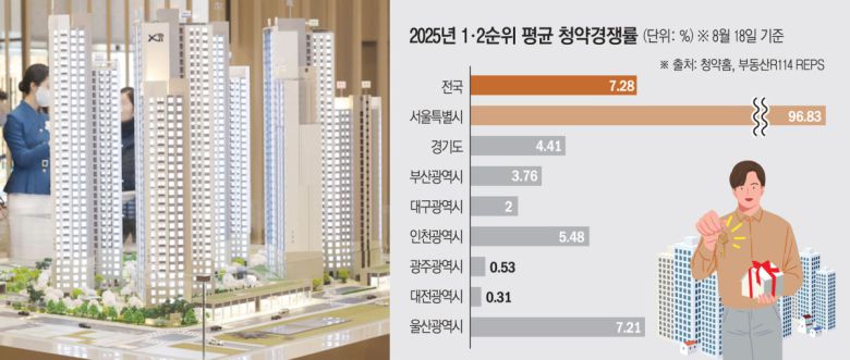 올해 전체를 봐도 서울만 두드러진다. 부동산R114의 자료를 보면 올해 전국 기준 1·2순위 평균 청약경쟁률은 7.28대 1인데 서울은 96.83대 1로 100대 1에 가깝다. 광주(0.53대 1)와 대전(0.31대1), 전남(0.21대1), 제주(0.48대1)는 소수점 경쟁률에 불과하다.